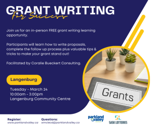 The first Grant Writing for Success will take place in Langenburg on March 24 at the Langenburg Community Centre from 10:00am – 3:00pm.