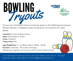 Tryouts for Parkland Valley’s bowling team at the 2026 Saskatchewan Winter Games in Meadow Lake/Flying Dust First Nation will take place: