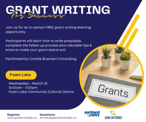 Grant Writing for Success will be held in Foam Lake at the Foam Lake Community Cultural Centre on March 25 from 10:00am – 3:00pm.